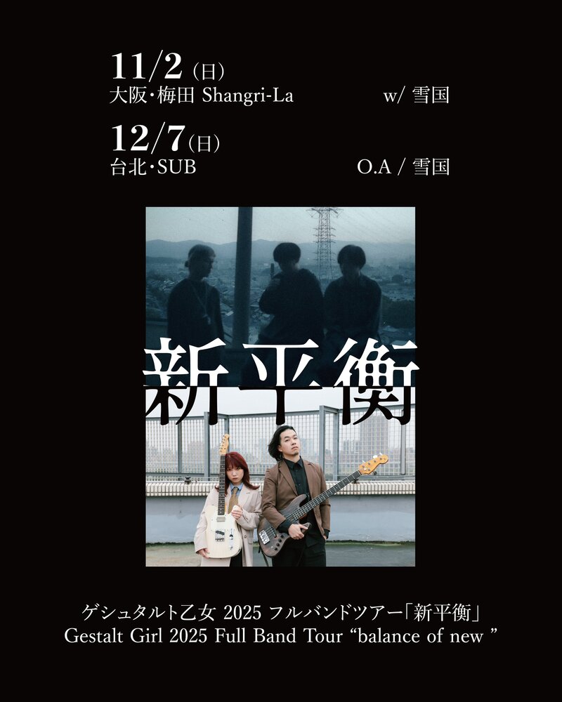 NEW TOUR『新平衡』in 大阪 SCHEDULE 2025/11/02(日) 梅田Shangri-La OPEN 17:00 / START 17:30 w/ 雪国 スタンディング(一般):¥4,500 / スタンディング(学割):¥3,000 チケットお申し込み URLをコピーする 報告する